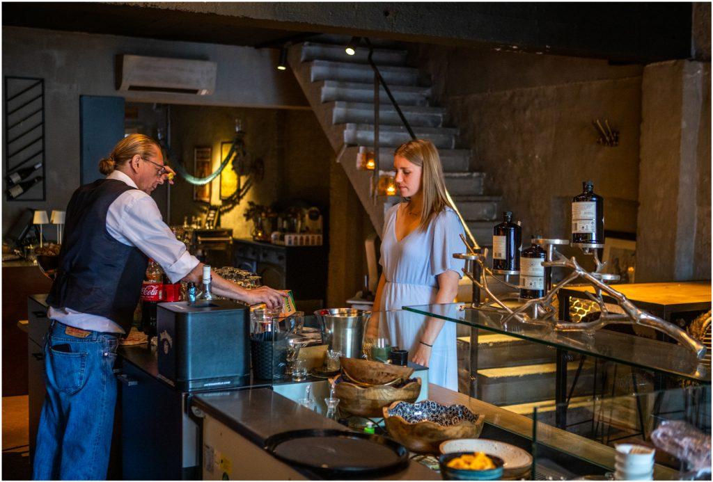 frisdrank en water. Alles wordt aan hoge tafels opgediend.
